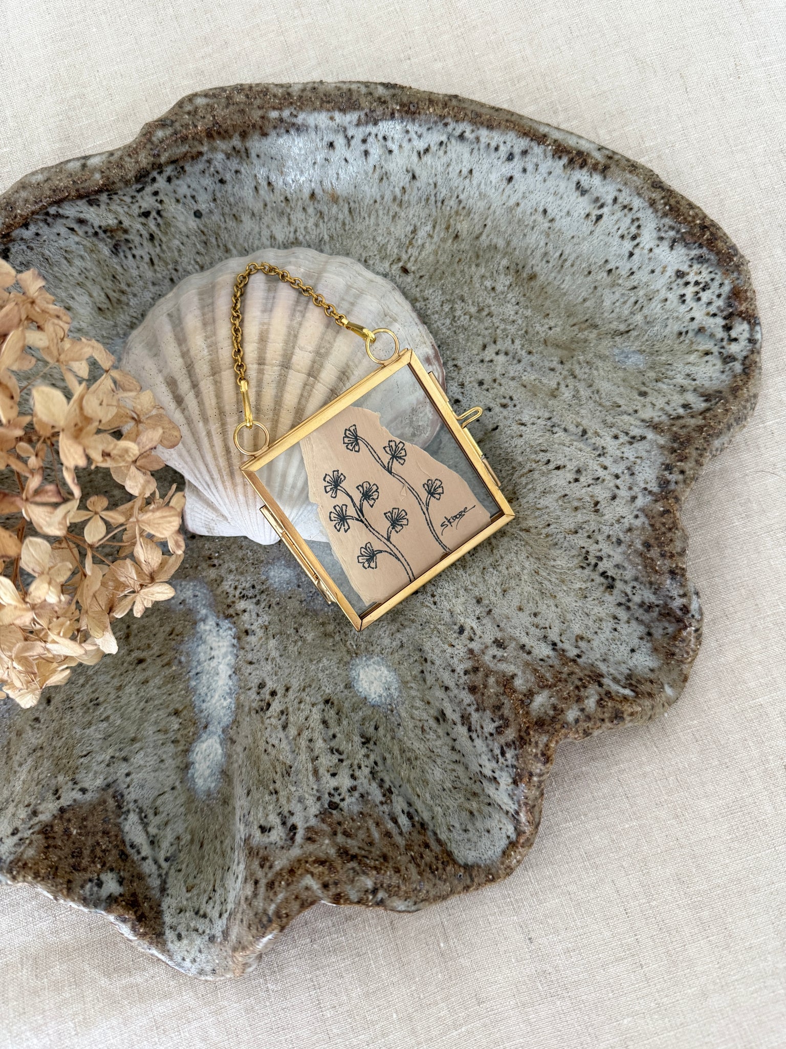 The elegant brass hanging frame showcases the live edges of the bark, preserving the artwork.