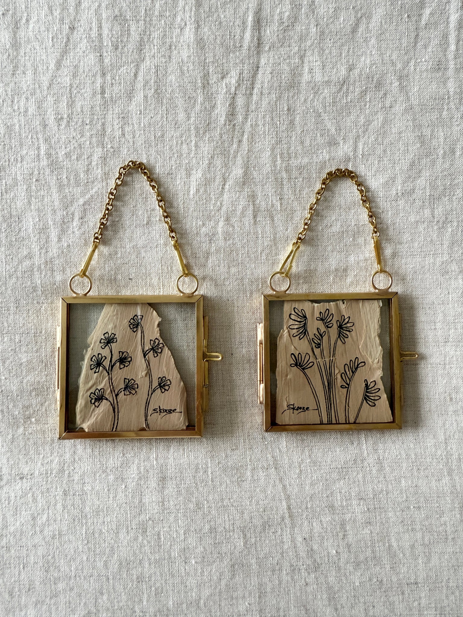 Each piece of bark is carefully chosen to suit it's individual frame. Focussing on composition, balance and texture. The artwork is then created to suit the shape of the bark and personally signed in archival ink. Each piece is pressed between two panes of glass, preserving the original artwork.