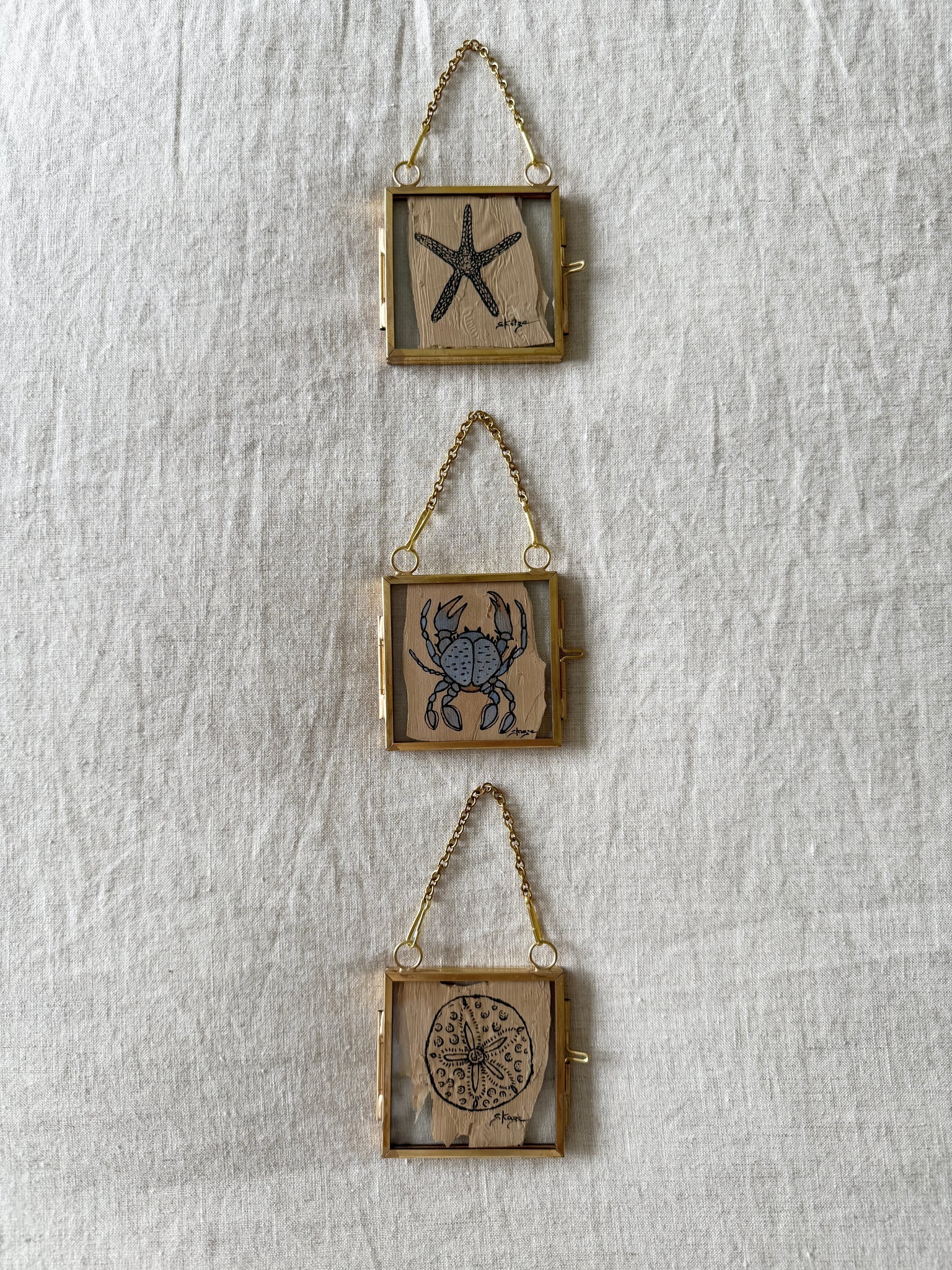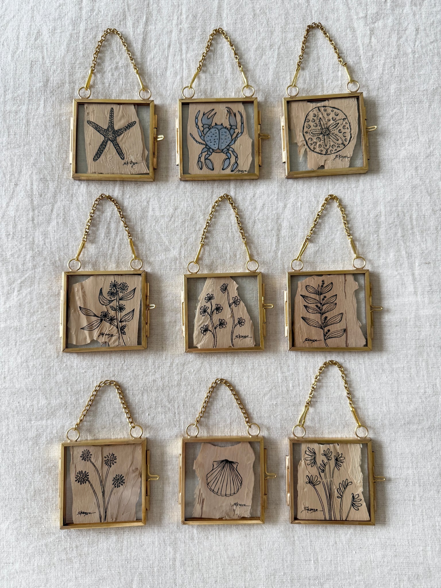 Each piece of bark is carefully chosen to suit it's individual frame. Focussing on composition, balance and texture. The artwork is then created to suit the shape of the bark and personally signed in archival ink. Each piece is pressed between two panes of glass, preserving the original artwork.